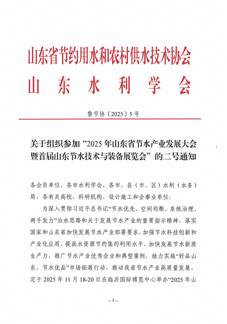 关于组织参加“2025年山东省节水产业发展大会暨首届山东节水技术与装备展览会”的二号通知